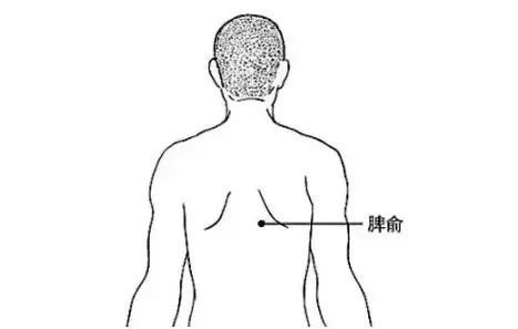 位置:脾俞穴位于背部,当第11胸椎棘突下,旁开1.5寸。肚脐对应的是第二腰椎,向上再摸三个椎体,大概下面旁开两指